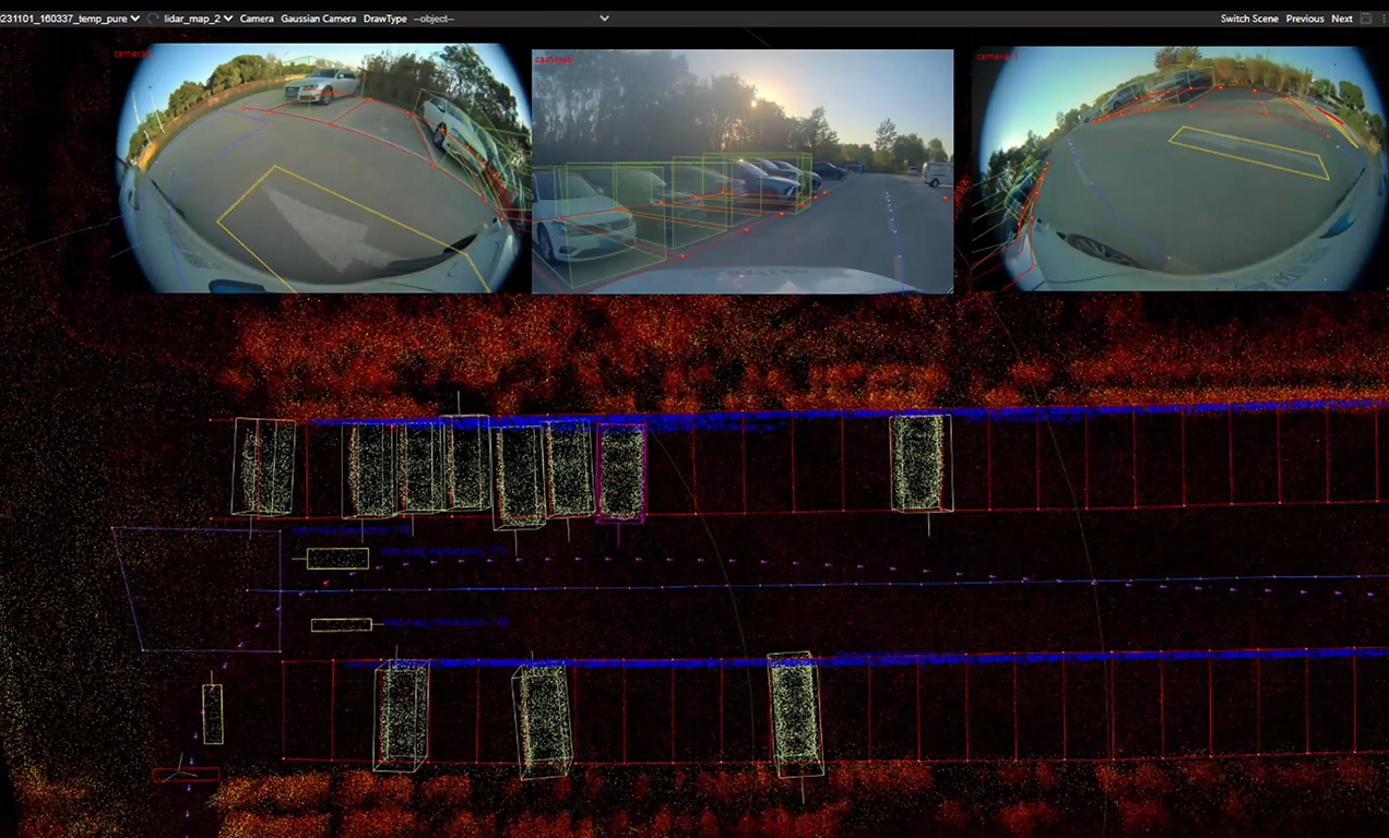 In the data-driven era, the production efficiency of high-quality data is of vital importance. Based on the pre-training results, our company's large model can pre-label key elements such as parking Spaces, obstacles, and ground elements in 4D data. With our 4D annotation tool, all annotation results can be directly imported for preview and made open, including those projected back onto the original image. Users can view, inspect, and adjust and refine the annotations through the interface, effectively enhancing the production efficiency of 4D data.